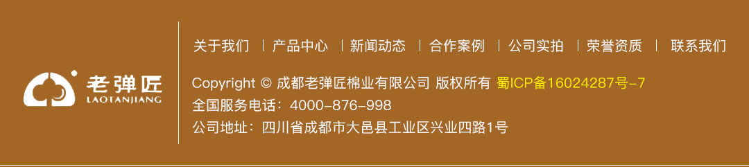 Copyright ??成都市老彈匠棉業(yè)有限公司 版權(quán)所有 蜀ICP備2021010586號(hào)-1 全國(guó)服務(wù)電話:4000-876-998 公司地址:四川省成都市大邑縣工業(yè)區(qū)興業(yè)四路1號(hào)